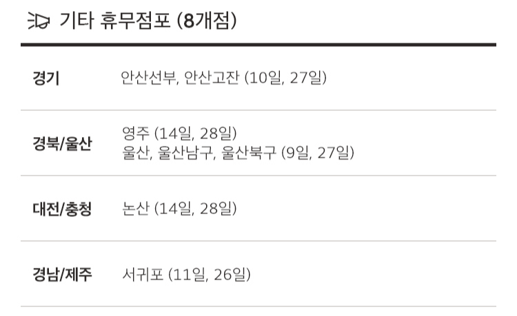 두번째로 2,4째주 수요일인 11월 9일과 11월 23일에도 여러 홈플러스 점포가 휴무하게 됩니다. 광역으로 살펴보면 경기, 경북/울산, 대전/충청, 강원 네 지역에 있는 지역이 해당합니다.