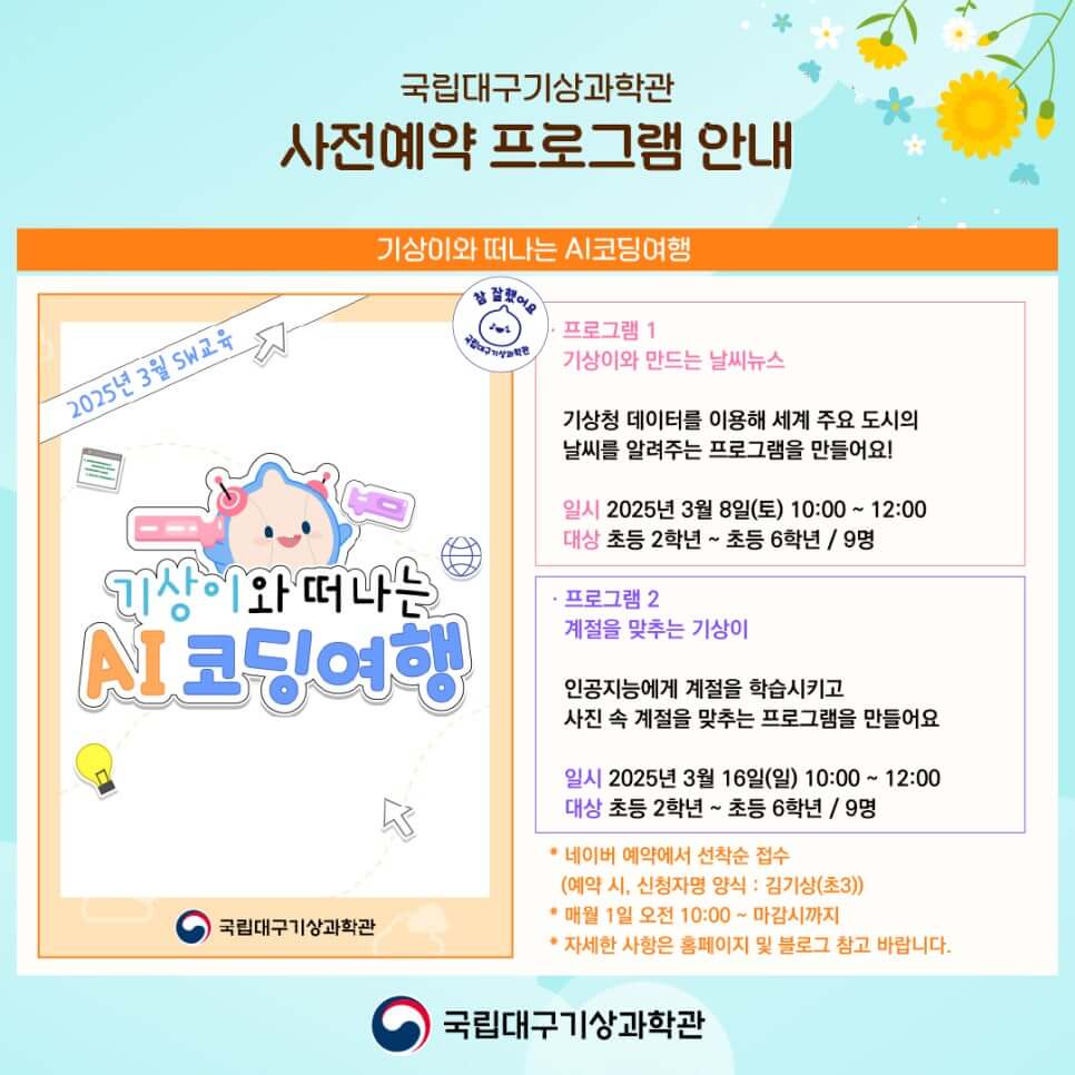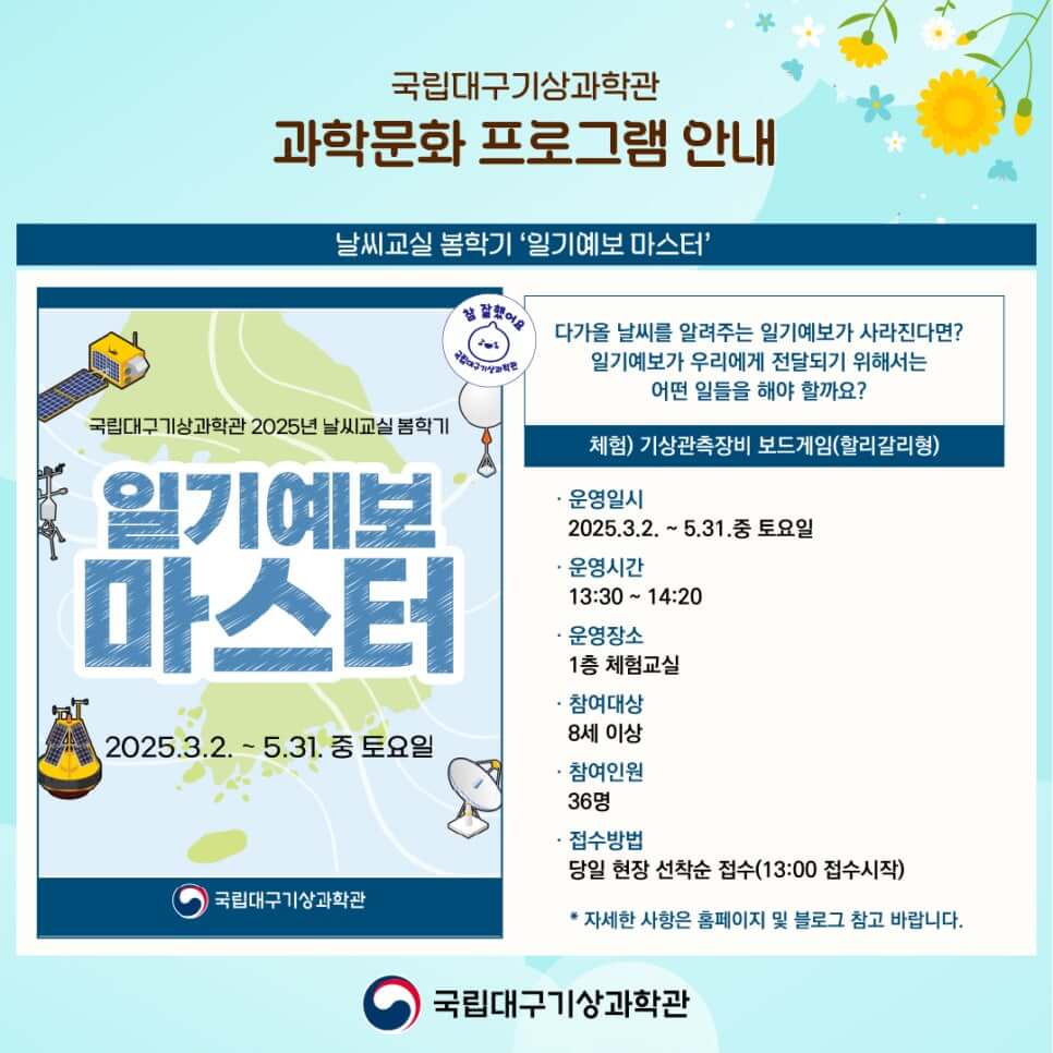 참여 방법: 각 프로그램별 현장 선착순 접수 또는 네이버 예약을 통해 사전 신청 가능하며, 자세한 사항은 국립대구기상과학관 홈페이지 및 블로그를 참고하면 됩니다.