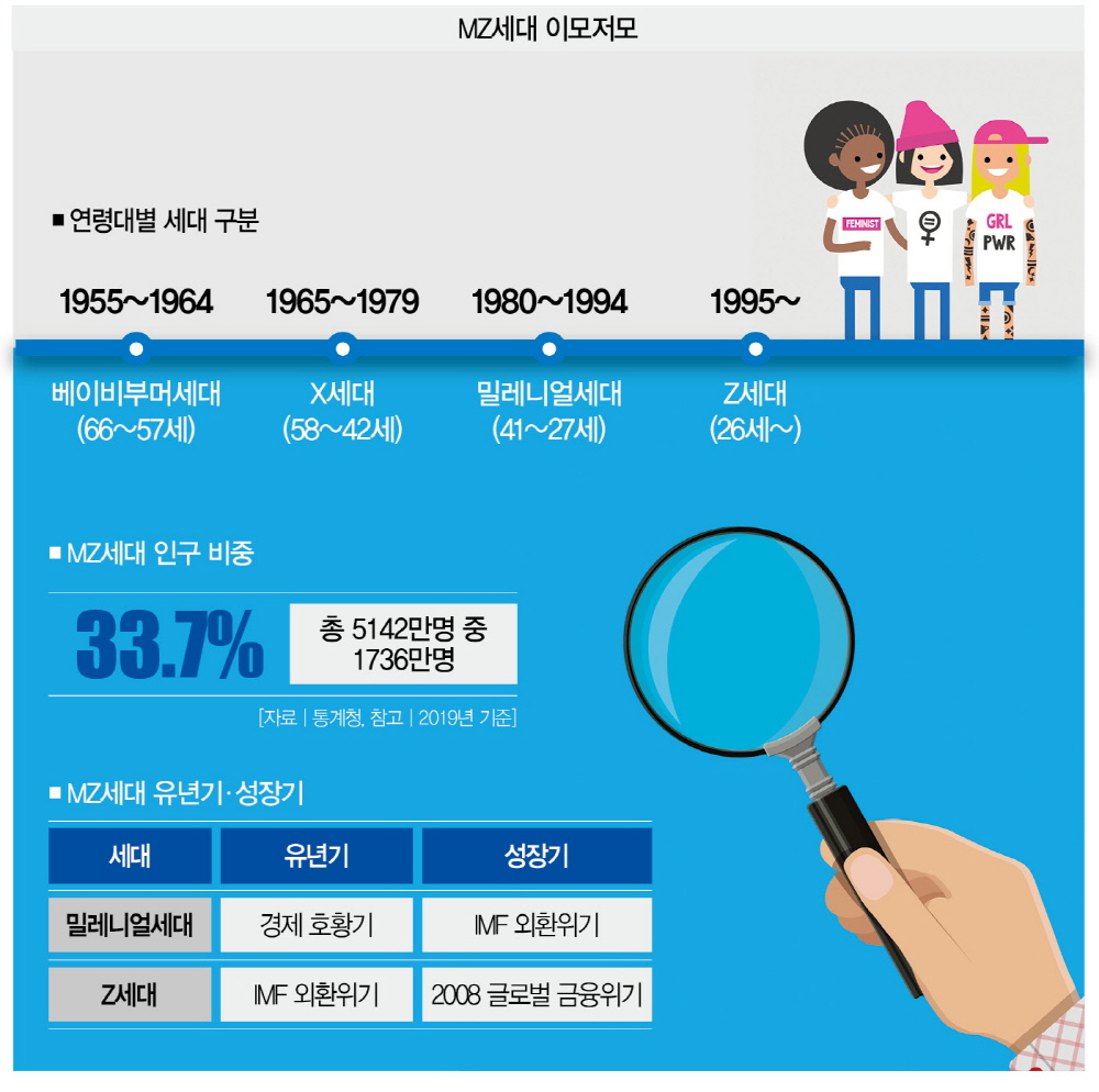 요즘 세대를 이야기하는 언론, 방송, 예능에서 빠지지 않고 나오는 단어는 바로 mz세대일 것입니다. mz세대는 사실 m세대로 불리는 1980년대 초반에서 2000년대 초반에 태어난 세대인 밀레니엄 세대와 1990년대 중반에서 2000년대 초반에 태어난 세대인 z세대를 아우르는 말로 대개 젊은 세대로 분류되는 특징인 색다른 경험 추구와 트렌트에 민감하며 디지털 환경에 매우 익숙한 세대로 이번 시간에는 mz세대에 대해 알아보겠습니다.